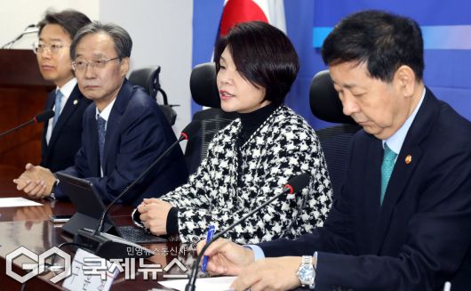 당정협의에서 인사말하는 한정애 더불어민주당 정책위의장