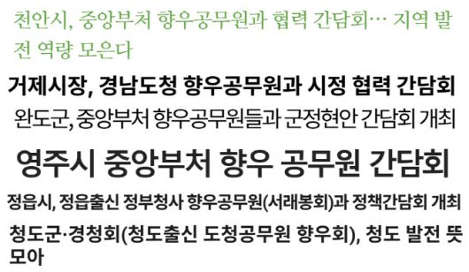 실제 기초지자체들은 광역자치단체 및 정부 부처에서 근무하는 해당 지자체 출신 공무원들과 정기적이거나 비정기적인 만남을 통해 유대를 형성하고 있는데, 포털사이트에서 잠깐만 검색해도 여러 기초지자체들이 광역·정부부처 소속 해당 지역 출신 공무원들과 간담회를 가졌다는 뉴스를 쉽게 찾아볼 수 있다.