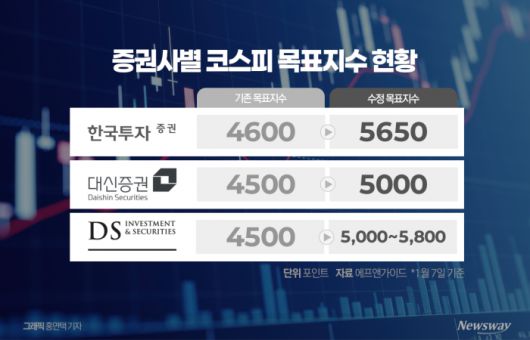 7일 금융투자업계에 따르면 이날 한국투자증권은 2026년 코스피 목표지수를 기존 4600포인트에서 5650포인트로 상향 조정했다. 이에 따라 코스피 예상 밴드는 4100~5650포인트로 제시됐다.