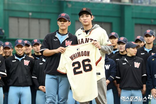 (엑스포츠뉴스 이천, 고아라 기자) 7일 오후 경기도 이천 LG챔피언스파크에서 열린 샌프란시스코 자이언츠 한국 방문 미디어데이, 이정후가 야구 클리닉에서 휘문고 후배들과 유니폼 전달식을 갖고 있다.고아라 기자 iknow@xportsnews.com