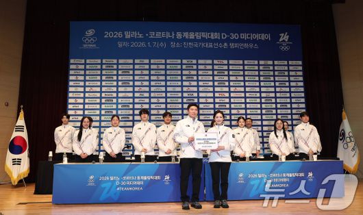 (진천=뉴스1) 김성진 기자 = 이수경 선수단장이 7일 충북 진천선수촌 챔피언하우스에서 열린 2026 밀라노코르티나동계올림픽대회 D-30 미디어데이에서 격려금을 전달한 후 유승민 대한체육회장과 기념촬영을 하고 있다. 2026.1.7/뉴스1ssaji@news1.krCopyright ⓒ 뉴스1. All rights reserved. 무단 전재 및 재배포, AI학습 이용 금지.