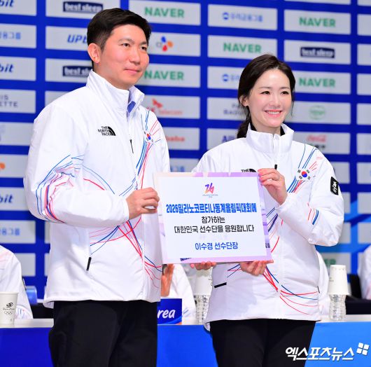 (엑스포츠뉴스 진천, 김한준 기자) 7일 오후 충북 대한체육회 진천국가대표선수촌에서 열린 2026 밀라노코르티나동계올림픽대회 D-30 미디어데이, 유승민 대한체육회장과 이수경 선수단장이 기념촬영을 갖고 있다.김한준 기자 kowel@xportsnews.com
