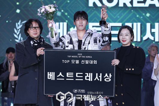 (서울=국제뉴스) 이대웅 기자 = 휴코드 & 아우어와 함께하는 '2025 TOP 모델 선발대회'가 지난 27일 오후 서울 광진구 그랜드 워커힐호텔 비스타홀에서 열렸다. 이날 청소년&성인 부문에서 베스트드레서상을 수상한 김종민이 중앙패션디자인협회 정도우 이사, 한국뉴욕주립대학교 FIT 패션경영학과 부교수 린다김과 함께 기념 포즈를 취하고 있다.