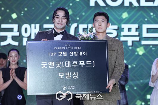 (서울=국제뉴스) 이대웅 기자 = 휴코드 & 아우어와 함께하는 '2025 TOP 모델 선발대회'가 지난 27일 오후 서울 광진구 그랜드 워커힐호텔 비스타홀에서 열렸다. 이날 청소년&성인 부문에서 굿앤굿(태후푸드) 모델상을 수상한 김관홍이 슈퍼모델 김재범과 함께 기념 포즈를 취하고 있다.