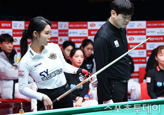 [고양(경기)=스포츠투데이 팽현준 기자] 7일 경기도 킨텍스 PBA스타디움에서 열린 웰컴저축은행 PBA 팀리그 2025-2026 5라운드 에스와이와 휴온스의 경기에서 에스와이 이우경이 샷을 하고 있다. 2026.01.07.