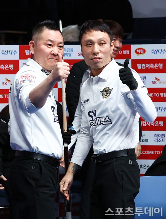 [고양(경기)=스포츠투데이 팽현준 기자] 7일 경기도 킨텍스 PBA스타디움에서 열린 웰컴저축은행 PBA 팀리그 2025-2026 5라운드 에스와이와 휴온스의 경기에서 에스와이 서현민과 최원준이 남자복식 승리를 따내고 있다. 2026.01.07. [스포츠투데이 팽현준 기자 sports@stoo.com]