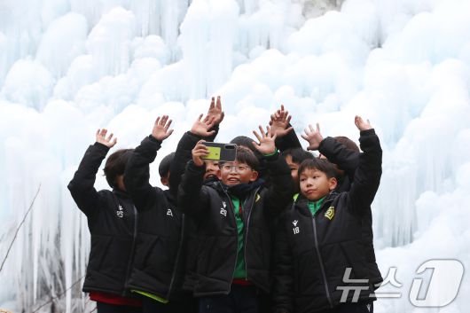 (대구=뉴스1) 공정식 기자 = 7일 오후 대구 달성군 유가읍 비슬산자연휴양림 얼음동산을 찾은 순천중앙초등학교 축구부 어린들이 꽁꽁 언 빙벽 앞에서 기념촬영을 하고 있다. 2026.1.7/뉴스1