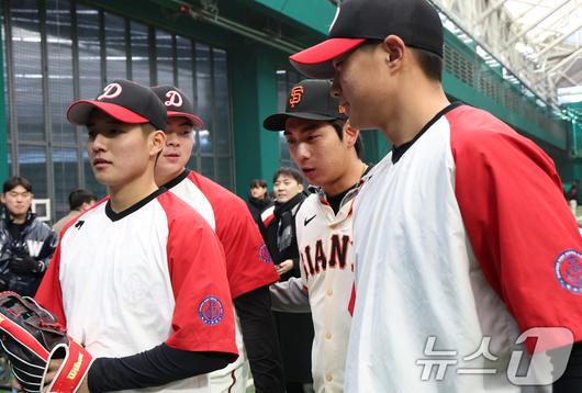 (이천=뉴스1) 김영운 기자 = 미국 프로야구 메이저리그(MLB) 샌프란시스코 자이언츠 이정후가 7일 경기 이천시 LG 챔피언스파크에서 고등학교 후배들에게 조언을 하고 있다. 2026.1.7/뉴스1
