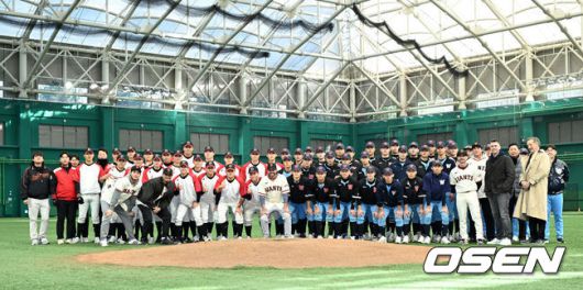 샌프란시스코 래리 베어 CEO, 버스터 포지 사장, 토니 비텔로 감독, 이정후, 윌리 아다메스이 휘문고, 덕수고 선수들과 기념촬영을 하고 있다. 2026.01.07 /sunday@osen.co.kr