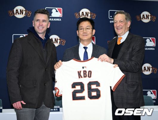 샌프란시스코 버스터 포지 사장, 래리 베어 CEO가 KBO 박근찬 사무총장과 기념촬영을 하고 있다. 2026.01.07 /sunday@osen.co.kr