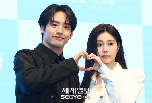 일본 배우 아카소 에이지(사진 왼쪽)와 배우 강혜원이 7일 서울 신도림 더 세인트 웨딩에서 열린 일본 TV TOKYO 드라마 프리미어23 ‘첫입에 반하다’ 제작발표회에 참석해 포즈를 취하고 있다.