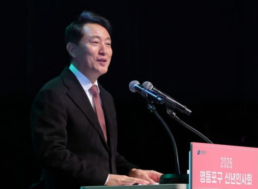 오세훈 서울시장이 지난 6일 서울 영등포구 영등포 아트홀에서 열린 2026 영등포구 신년인사회에서 새해 인사를 하고 있다./사진=뉴스1 |
