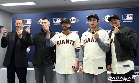 (엑스포츠뉴스 이천, 고아라 기자) 7일 오후 경기도 이천 LG챔피언스파크에서 열린 샌프란시스코 자이언츠 한국 방문 미디어데이, 샌프란시스코 자이언츠 래리 베어 CEO, 버스터 포지 사장, 토니 비텔로 감독, 이정후, 윌리 아다메스 선수가 포토타임을 갖고 있다.