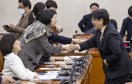 정은경 보건복지부 장관(오른쪽)이 7일 국회에서 열린 보건복지위원회 전체 회의에서 아동수당법 개정안 통과된 뒤 한지아 국민의힘 의원을 비롯한 야당 의원들과 인사하고 있다. [연합] |