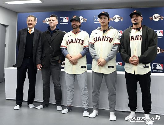 (엑스포츠뉴스 이천, 고아라 기자) 7일 오후 경기도 이천 LG챔피언스파크에서 열린 샌프란시스코 자이언츠 한국 방문 미디어데이, 샌프란시스코 자이언츠 래리 베어 CEO, 버스터 포지 사장, 토니 비텔로 감독, 이정후, 윌리 아다메스 선수가 포토타임을 갖고 있다.고아라 기자 iknow@xportsnews.com