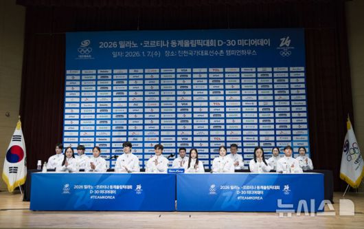 [진천=뉴시스] 김근수 기자 = 7일 충북 진천 국가대표선수촌에서 열린 밀라노코르티나 동계올림픽 D-30 미디어데이에서 선수들이 박수를 치고 있다. 2026.01.07. ks@newsis.com |