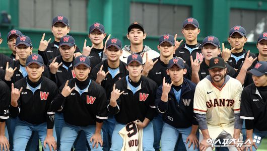 (엑스포츠뉴스 이천, 고아라 기자) 7일 오후 경기도 이천 LG챔피언스파크에서 열린 샌프란시스코 자이언츠 한국 방문 미디어데이, 이정후가 휘문고와 덕수고 선수 60여 명을 초청한 야구 클리닉에서 포토타임을 갖고 있다. 고아라 기자 iknow@xportsnews.com