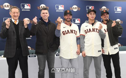 미국 메이저리그 샌프란시스코 자이언츠의 래리 베어 CEO, 버스터 포지 사장, 토니 비텔로 감독, 이정후, 윌리 아다메스(왼쪽부터)가 7일 경기도 이천 LG챔피언스파크에서 진행된 미디어데이 행사에서 취재진을 향해 포즈를 취하고 있다. 2026. 1. 7.