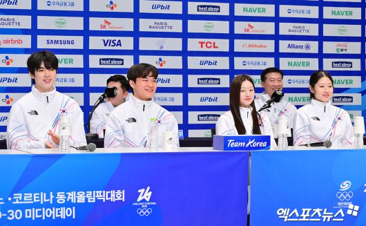 (엑스포츠뉴스 진천, 김한준 기자) 7일 오후 충북 대한체육회 진천국가대표선수촌에서 열린 2026 밀라노코르티나동계올림픽대회 D-30 미디어데이, 차준환 김현겸 신지아 이해인이 취재진의 질문을 듣고 있다.김한준 기자 kowel@xportsnews.com