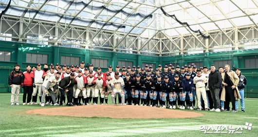 (엑스포츠뉴스 이천, 고아라 기자) 7일 오후 경기도 이천 LG챔피언스파크에서 열린 샌프란시스코 자이언츠 한국 방문 미디어데이, 샌프란시스코 자이언츠 래리 베어 CEO, 버스터 포지 사장, 토니 비텔로 감독, 이정후, 윌리 아다메스 선수가 휘문고, 덕수고 초청된 선수들과 함께 포토타임을 갖고 있다.고아라 기자 iknow@xportsnews.com