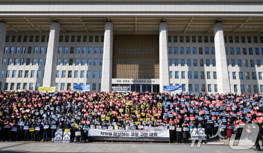 (서울=뉴스1) 유승관 기자 = (사)한국외식업중앙회 등 자영업자를 비롯한 참석자들이 7일 서울 여의도 국회 본청 앞 계단에서 열린 자영업 말살하는 쿠팡 규탄대회에서 구호를 외치고 있다. 2026.1.7/뉴스1