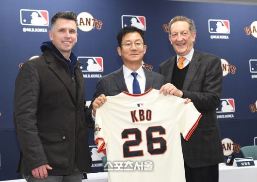 미국 메이저리그 샌프란시스코 자이언츠의 버스터 포지 사장(왼쪽)과 래리 베어 CEO가 7일 경기도 이천 LG챔피언스파크에서 진행된 미디어데이 행사에서 박근찬 KBO 사무총장에게 기념 유니폼을 전달하고 있다. 2026. 1. 7.