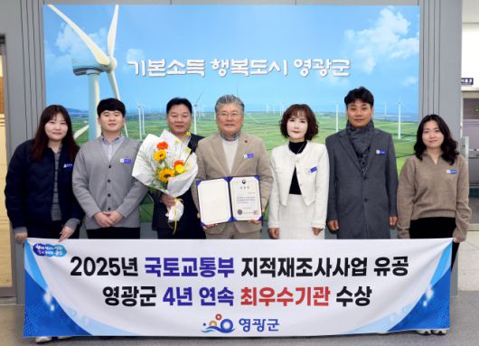 영광군은 국토교통부가 주관한 '2025년 지적재조사사업 업무 평가'에서 4년 연속 최우수기관으로 선정돼 국토교통부장관 기관 표창을 수상했다고 7일 밝혔다.