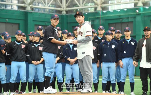 미국 메이저리그 샌프란시스코 자이언츠의 이정후(오른쪽)가 7일 경기도 이천 LG챔피언스파크에서 진행된 미디어데이 행사에서 클리닉에 참가한 휘문고 후배들에게 기념 유니폼을 전달하고 있다. 2026. 1. 7.이천 | 박진업 기자 upandup@sportsseoul.com [기사제보 news@sportsseoul.com] Copyright ⓒ 스포츠서울&sportsseoul.com