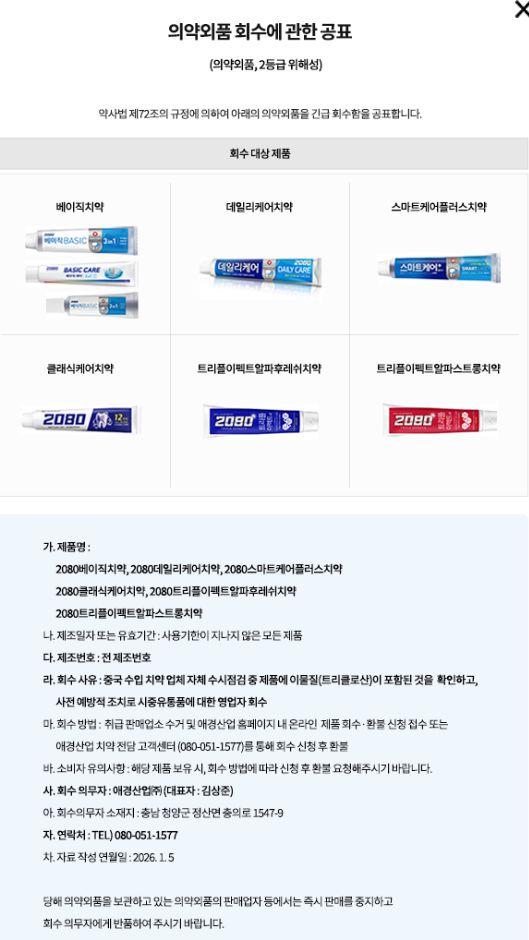 회수 대상은 ‘2080 베이직치약’, ‘2080 데일리케어치약’, ‘2080 스마트케어플러스치약’, ‘2080 클래식케어치약’, ‘2080 트리플이펙트 알파 후레쉬치약’, ‘2080 트리플이펙트 알파 스트롱치약’이다.