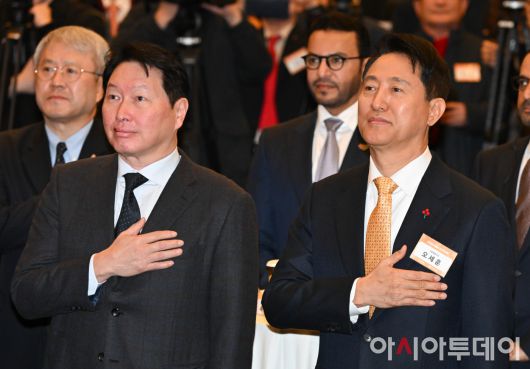 오세훈 서울시장(오른쪽)과 최태원 서울상공회의소 회장이 7일 서울 중구 대한상공회의소에서 열린 2026 서울시 신년인사회에 참석해 국민의례를 하고 있다. /정재훈 기자