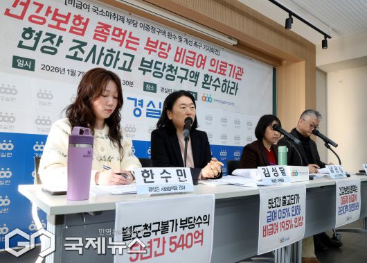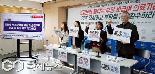 (서울=국제뉴스) 7일 서울 종로구 경제정의실천시민연합(경실련)에서 경실련 활동가들이 비급여 국소마취제 부당 이중청구액 환수 및 개선 촉구 기자회견을 하고 있다./사진=이용우 기자