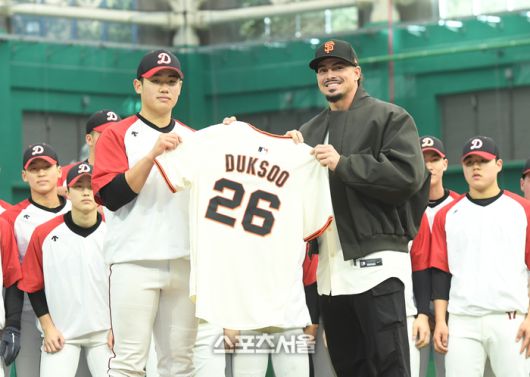 미국 메이저리그 샌프란시스코 자이언츠의 유격수 윌리 아다메스(오른쪽)가 7일 경기도 이천 LG챔피언스파크에서 진행된 미디어데이 행사에서 클리닉에 참가한 덕수고 선수들에게 기념 유니폼을 전달하고 있다. 2026. 1. 7.이천 | 박진업 기자 upandup@sportsseoul.com [기사제보 news@sportsseoul.com] Copyright ⓒ 스포츠서울&sportsseoul.com