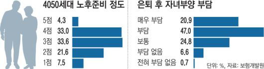 40·50세대 대부분이 노후 준비 필요성을 느끼고 있으나 실제 노후 준비가 충분히 돼 있다고 생각하는 이들은 10명 중 4명에 그쳤고, 개인연금을 따로 가입한 사람도 10명 중 1명에 불과했다. 결국 은퇴할 때 받는 퇴직급여로 자녀들의 결혼이나 교육에 필요한 비용을 대기도 빠듯한 상황인 것으로 나타났다.