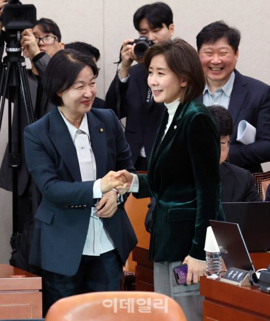[이데일리 노진환 기자] 추미애 국회 법사위원장과 나경원 국민의힘 의원이 7일 서울 여의도 국회에서 열린 법제사법위원회 전체회의에 참석하며 악수하고 있다.