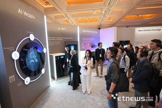 세계 최대 가전·정보기술(IT) 전시회 'CES 2026'이 개막한 6일(현지시간) 미국 네바다주 라스베이거스 윈 호텔에 마련된 삼성전자 단독 전시관에서 세탁기와 건조기 등에 적용된 AI 기술을 살펴보고 있다. 라스베이거스=이동근기자 foto@etnews.com [Copyright © 전자신문. 무단전재-재배포금지]