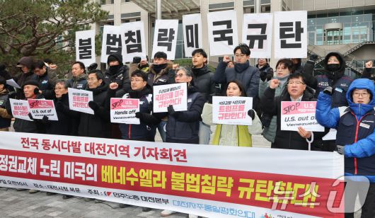 (대전=뉴스1) 김기태 기자 = 대전시민사회단체 구성원들이 7일 대전시청앞에서 '자원강탈과 정권교체를 노린 미국의 베네수엘라 불법침략 규탄' 기자회견을 열고 있다. 2026.1.7/뉴스1