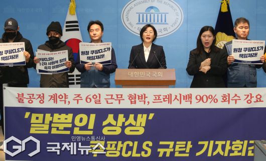 (서울=국제뉴스) 정혜경 진보당 의원이 7일 오전 서울 여의도 국회 소통관에서 쿠팡CLS 규탄 기자회견을 하고 있다./사진=이용우 기자