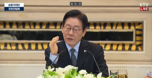 이재명 대통령 순방기자단 오찬간담회. 케이티브이 중계화면 갈무리 |