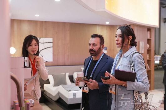 (서울=뉴스1) = 세라젬이 6일부터 9일(현지시간)까지 미국 라스베이거스에서 개최되는 CES 2026의 세라젬 전시관에 영화 ‘탑건: 매버릭’에 출연한 모델 겸 배우 줄리아 루페티가 방문했다고 7일 밝혔다 사진은 모델 겸 배우 줄리아 루페티가 '밸런스 메디워터 AI'를 살펴보는 모습. (세라젬 제공. 재판매 및 DB 금지) 2026.1.7/뉴스1