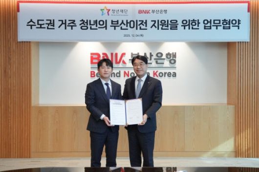 2025년 12월 4일 청년재단과 BNK부산은행이 수도권 거주 청년의 부산 이전 지원을 위한 업무협약을 체결했다. (좌측부터 오창석 청년재단 이사장, 방성빈 BNK부산은행 은행장) |