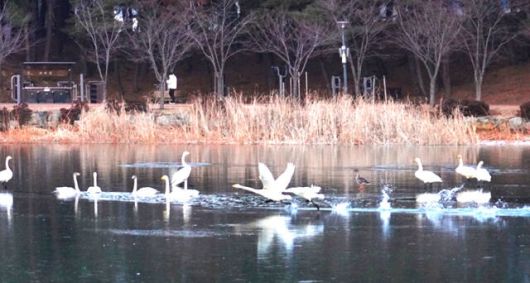 이날 연못 위에 머물던 고니 무리가 일제히 날아오르며 공원 일대는 잠시 활기를 띠었다.