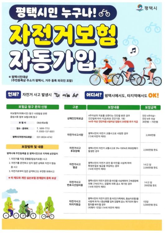 경기 평택시가 시민의 안전한 자전거 이용을 지원하기 위해 전 시민 대상 자전거 보험을 올해도 갱신 가입했다고 7일 밝혔다.