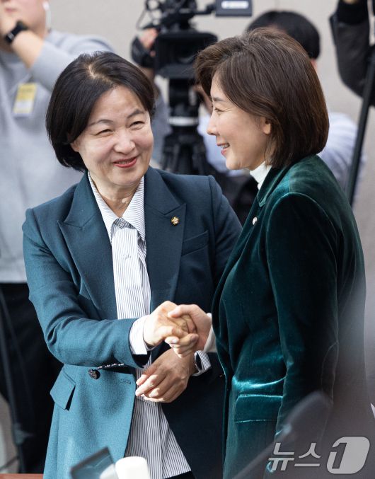 (서울=뉴스1) 이승배 기자 = 7일 서울 여의도 국회에서 열린 제430회국회(임시회) 법제사법위원회 제3차 전체회의에서 추미애 위원장이 나경원 국민의힘 의원과 새해 인사를 나누고 있다. 2026.1.7/뉴스1