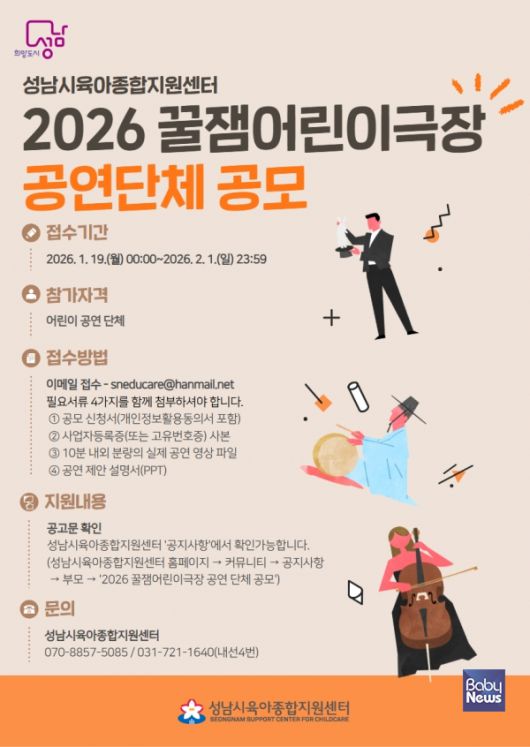성남시육아종합지원센터(센터장 서원경)는 오는 19일부터 2월 1일까지 영유아 발달 특성에 맞춘 특화된 공연을 제공할 수 있는 어린이 공연단체를 대상으로 공연 공모를 진행한다. ⓒ성남시육아종합지원센터 |