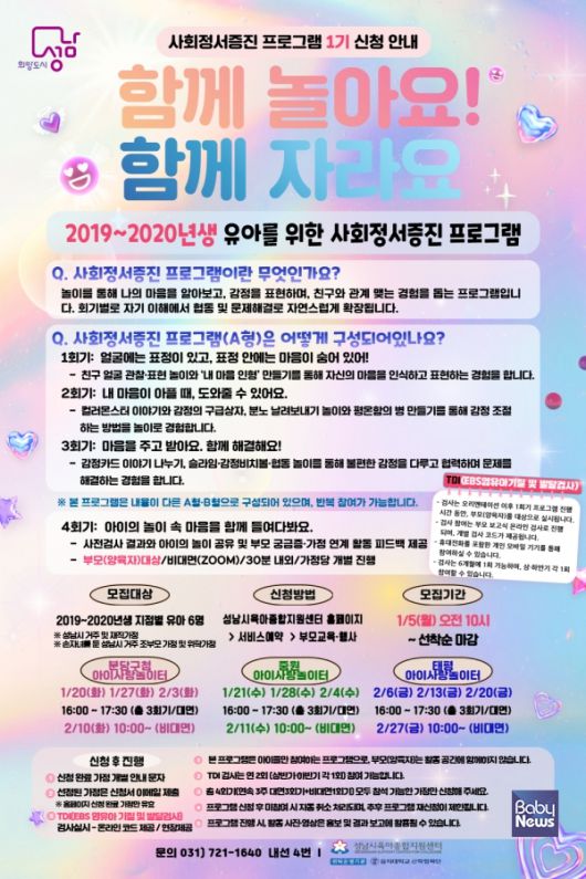 한편 사회정서증진 프로그램은 성남시 영유아 가정을 대상으로 운영되며, 자세한 내용은 성남시육아종합지원센터 홈페이지를 통해 확인할 수 있다.