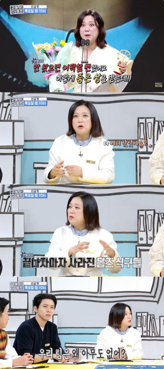 이후 김숙은 ‘구해줘! 홈즈’ 멤버들에게 섭섭함을 토로했다. 김숙은 “조금 서운한 게 있다. 다 어디 갔어요?”라며, “끝나고 다 팀들별로 사진을 찍던데 저 혼자 서 있더라 무대에. ‘전참시’ 팀 저쪽에 있고, ‘나혼산’ 팀 저쪽에 있고 다 단체 사진을 찍고 있었다. 우리 팀은 왜 아무도 없어”라고 수상 당시 상황을 설명하며 섭섭해 했다.