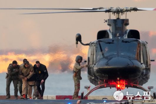 2026년 1월 5일, 미국 뉴욕시에서 미 마약단속국(DEA) 요원들이 체포된 니콜라스 마두로 전 베네수엘라 대통령을 헬기에서 내려 법원으로 이송하고 있다. [사진=로이터 뉴스핌] |