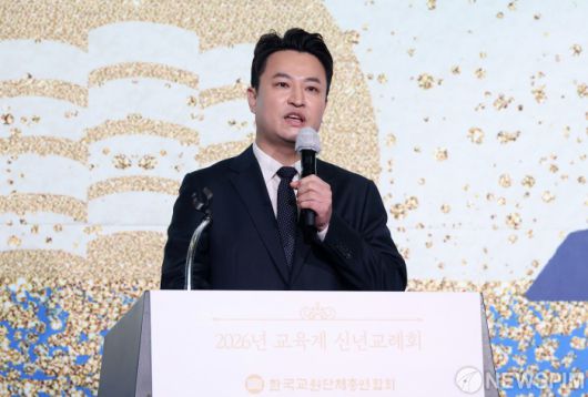[서울=뉴스핌] 정일구 기자 = 강주호 한국교원단체총연합회(교총) 회장이 7일 오후 서울 영등포구 FKI타워 컨퍼런스센터에서 열린 2026년 교육계 신년교례회에서 환영사를 하고 있다. 2026.01.07 mironj19@newspim.com