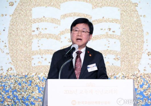 [서울=뉴스핌] 정일구 기자 = 최교진 교육부 장관이 7일 오후 서울 영등포구 FKI타워 컨퍼런스센터에서 열린 2026년 교육계 신년교례회에서 축사를 하고 있다. 2026.01.07 mironj19@newspim.com