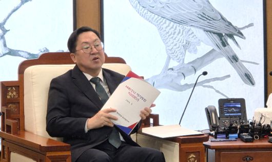 대전·충남 행정통합 방향을 논의하러 24일 충남도청에서 김태흠 지사를 만난 이장우 대전시장이 기존 발의된 행정통합 특별법안의 내용을 설명하고 있다. 연합뉴스 |